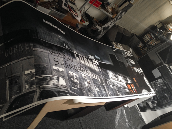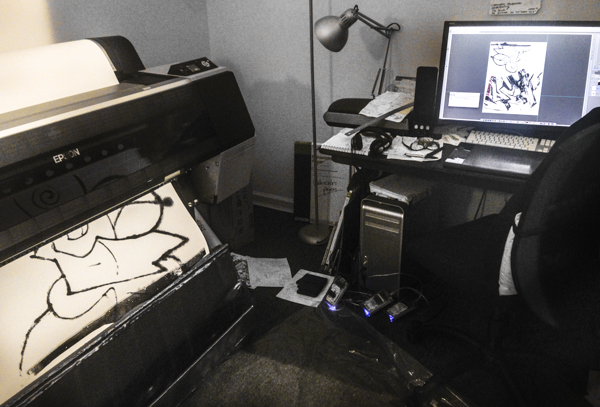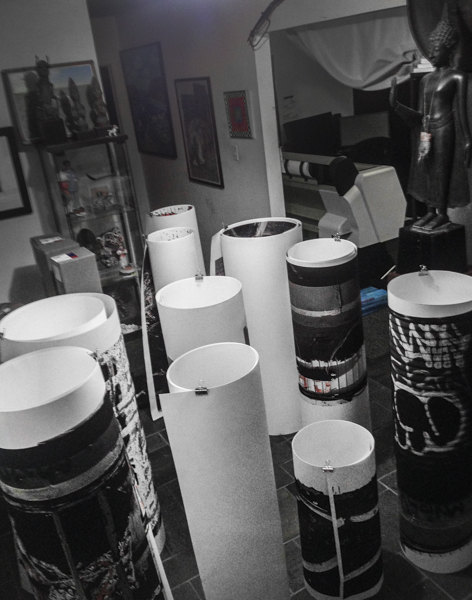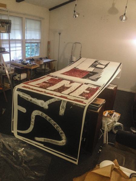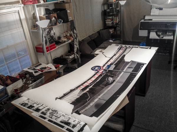 .…so I sold my Yamaha Piano and my dads and grandfathers Omega watches (that’s ironic because Swatch owns Omega) and bought a 44” Epson 9890 Printer…YES, I did do that; I call him Monster, he’s HUGE. With the generous help of everyone who contributed to my IndieGogo Venice Project I bought 150 feet of 44 inch wide Fine Art printing paper ($1400), five yards of red cotton cloth ($25), 5 cans of black spray paint (@ Lowes only $2.75 a can!), a full set of large inks for the printer ($1900), a LaCie 4 gigabyte hard drive ($249.99), Black, White and Red ‘Map Tacks’ ($24.71) and An LED “BREAKFAST” sign ($180.05) so now I was ready to go into production. The piece, on my computer screen, about 13 inches in length, looked really cool and sweet, but I knew, lurking behind it’s cute exterior was just a crap load of seriously hard work. The rub is, the piece was done in pixels. Anyone could have built it with some overseeing by myself, that’s when assistants are gold and professional print makers even more so, but I didn’t have the money for that and looking at this monstrous job and not knowing if it would work out after I raised $13,000 to make the project happen, was seriously un-fun. So, I made a cup of tea, looked at it despairingly and then pressed PRINT.