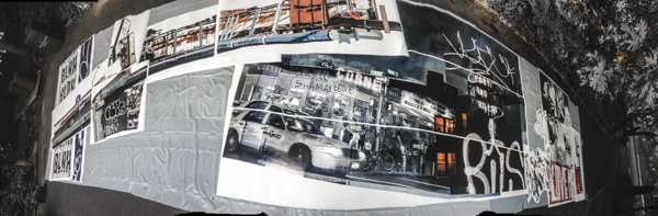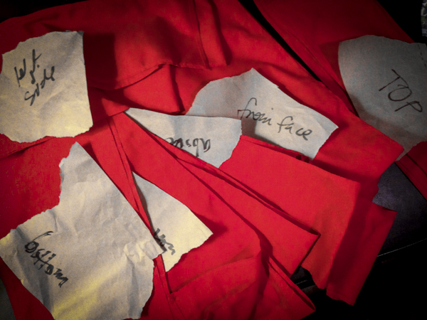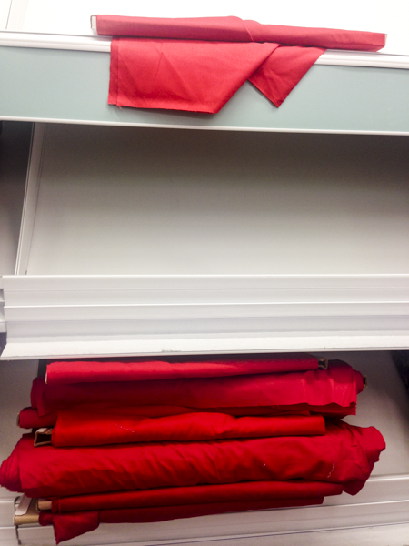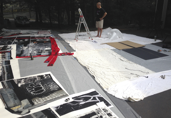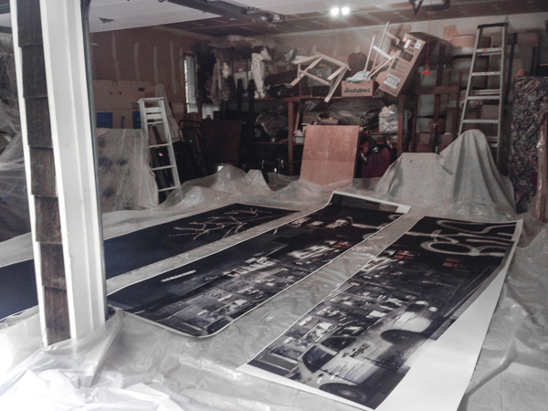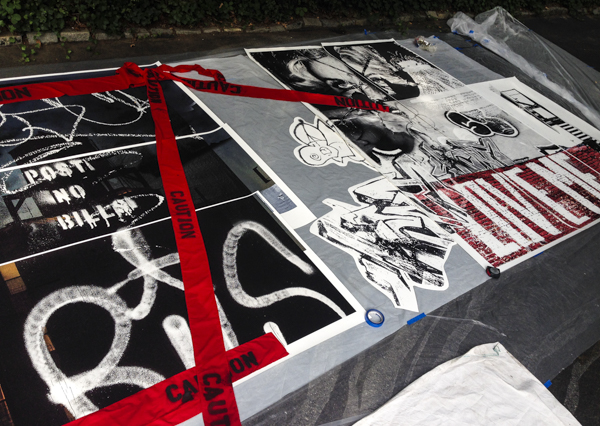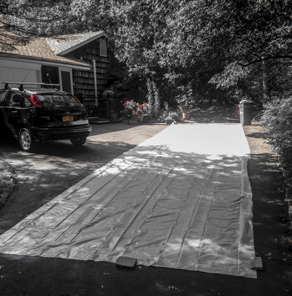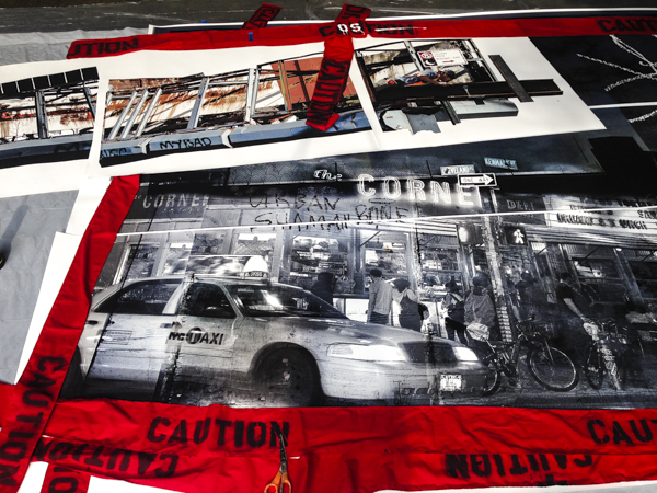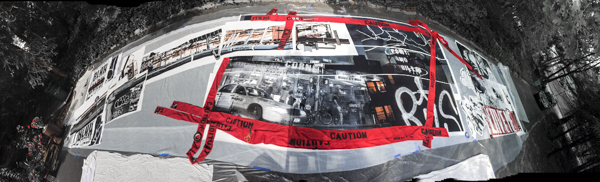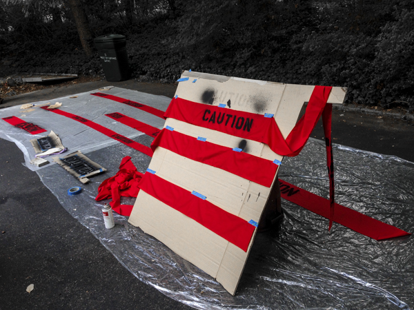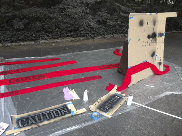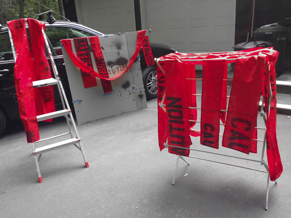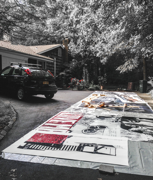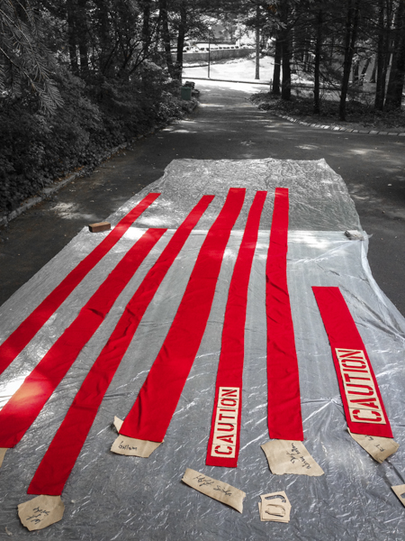 After printing 150 feet of Fine Art Paper (yikes), I rolled it up in to sections and brought one section outside at a time and laid it out to see what I had. Then I spent 3 hours cleaning the floor of the garage and hosing it down to put down plastic and the middle section, to work on the CAUTION tape I sewed… I spent hours trying to find the perfect red material, finally did + then sewed all the edges of all of it (ugh)…. Spray painted them with a stencil, and worked on this in the garage.
